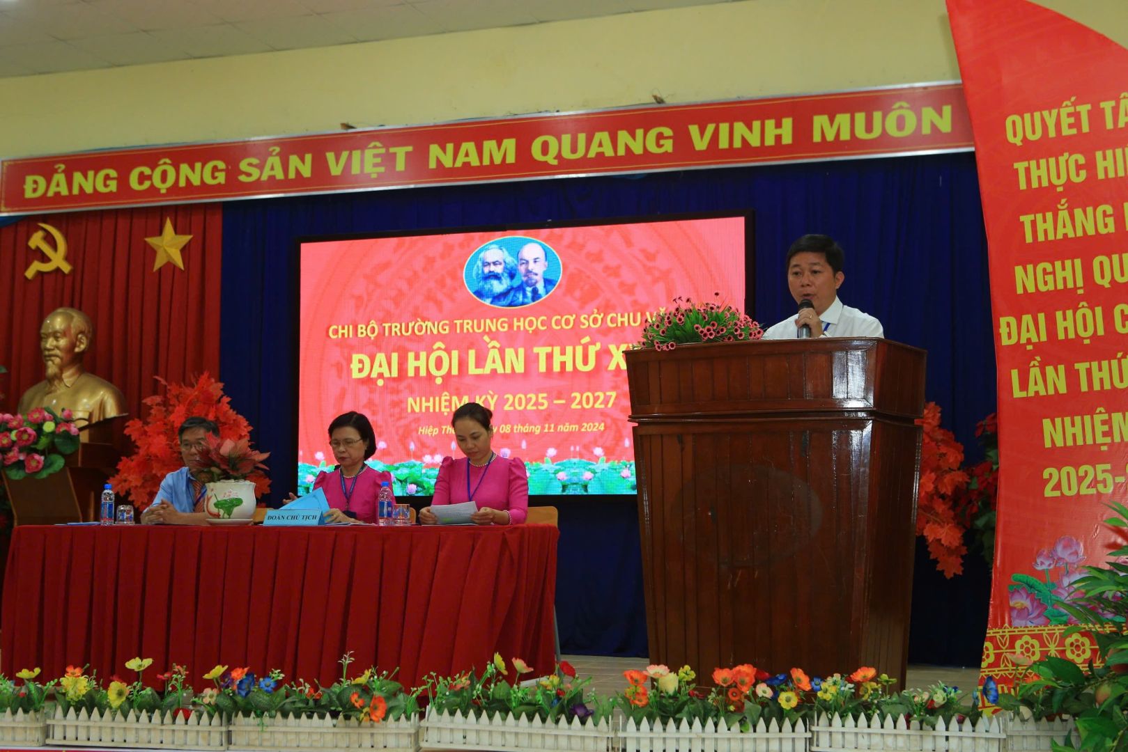 Phát biểu chỉ đạo tại Đại hội, đồng chí Lê Hoàng Minh đã ghi nhận và biểu dương những thành tích xuất sắc mà chi bộ Trường THCS Chu Văn An đã đạt được trong nhiệm kỳ vừa qua. Công tác chuẩn bị đại hội của chi bộ nghiêm túc, đúng theo kế hoạch; thực hiện các bước, quy trình công tác nhân sự Đại hội, xây dựng văn kiện, chuẩn bị các điều kiện cơ sở vật chất phục vụ Đại hội được đảm bảo. Đồng chí đề nghị chi bộ tiếp tục thực hiện tốt nghị quyết Trung ương 4 khóa XII về xây dựng, chỉnh đốn Đảng; Kết luận 01-KL/TW của Bộ chính trị, các cuộc vận động, các phong trào do ngành giáo dục và phường phát động; nâng cao chất lượng sinh hoạt chi bộ; làm tốt công tác kiểm tra, giám sát; đẩy mạnh việc phát triển đảng, làm tốt công tác tuyên truyền và tổ chức thực hiện nghị quyết Đại hội Đảng toàn quốc, nghị quyết Đại hội Đảng bộ các cấp nhiệm kỳ 2025 - 2030; đẩy mạnh việc giáo dục đạo đức, kỹ năng sống và ý thức công dân cho học sinh; thực hiện tốt công tác xã hội hóa giáo dục,...