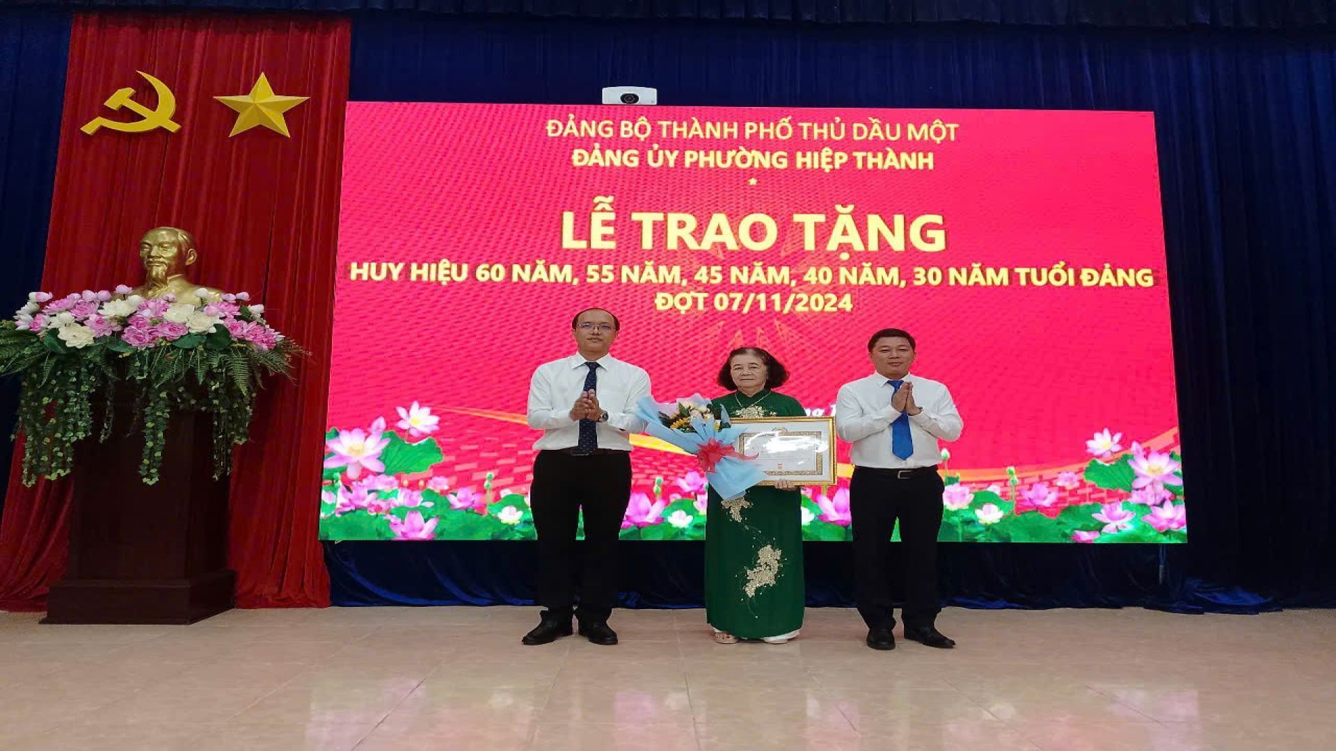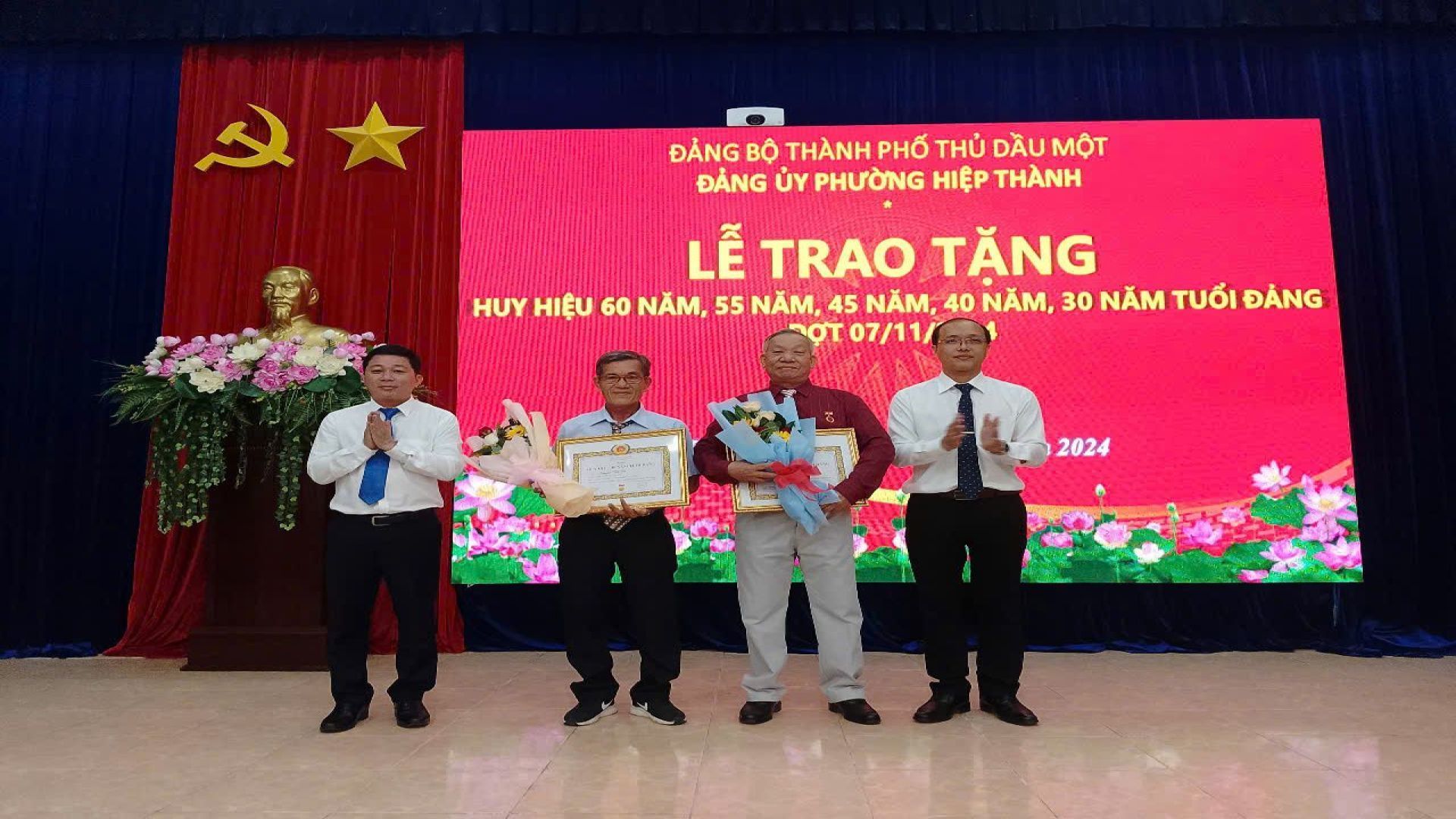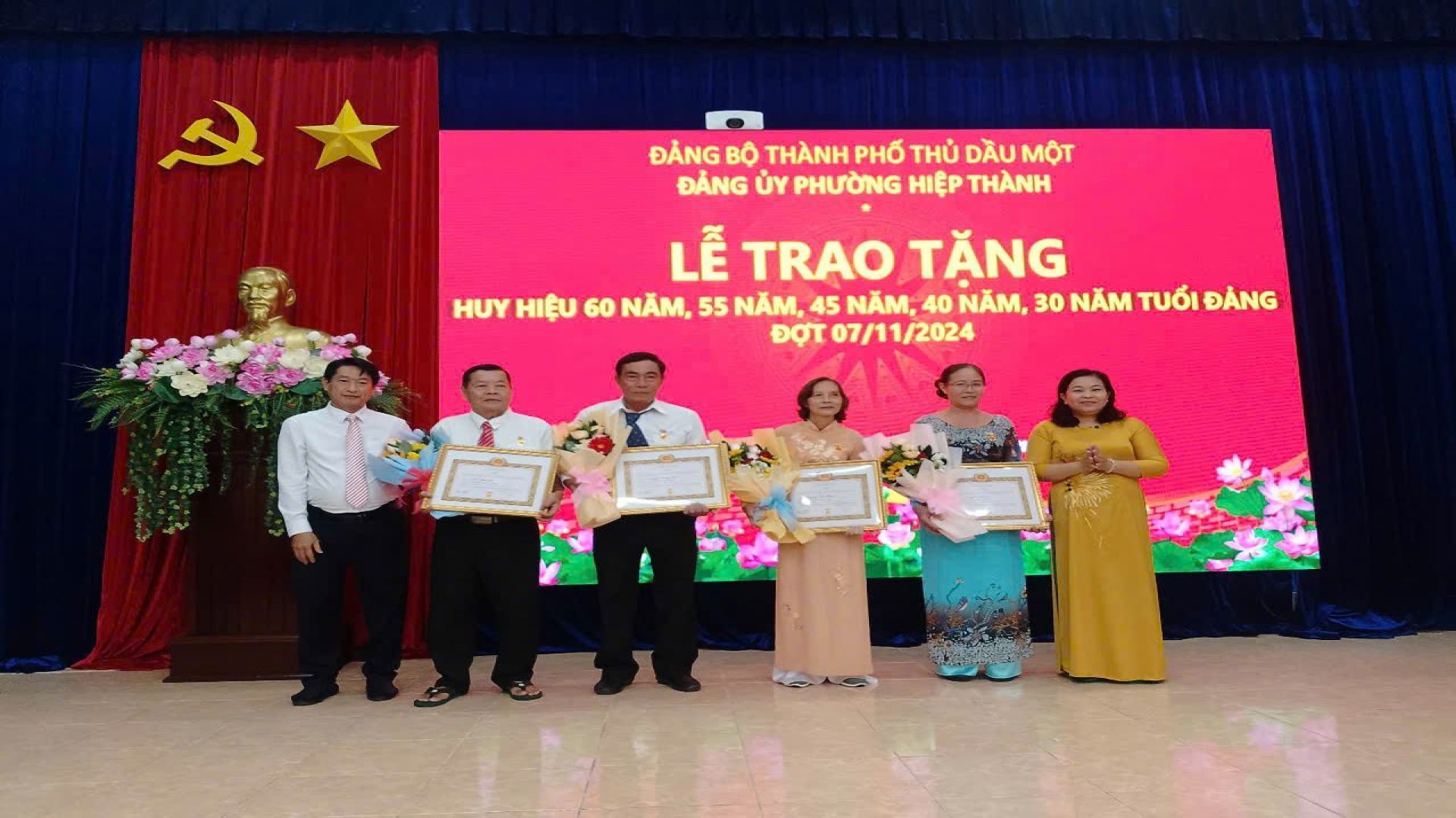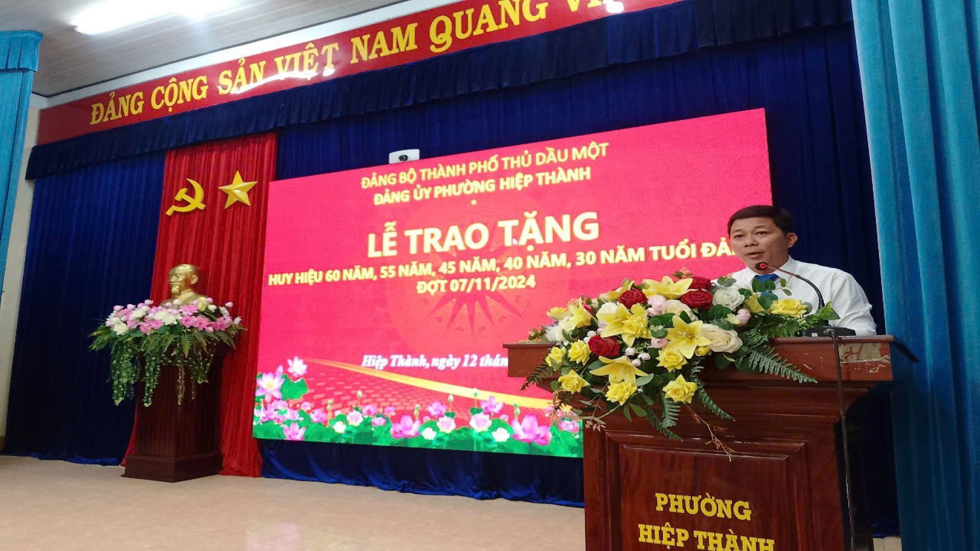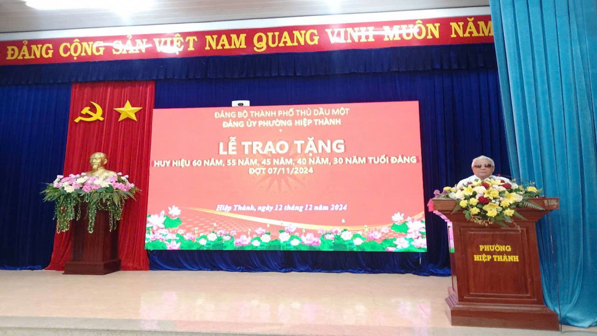 Sáng ngày 12/12/2024, Đảng ủy phường Hiệp Thành tổ chức Lễ trao Huy hiệu Đảng đợt 07/11/2024. Dự buổi lễ có đồng chí Phạm Minh Thiện - UVBTV, Chủ nhiệm UBKT Thành ủy; đồng chí Lê Hoàng Minh - TUV, Bí thư Đảng uỷ; đồng chí Lê Thị Kim Cúc - Phó Bí thư Thường trực Đảng uỷ, Chủ tịch Hội đồng nhân dân; đồng chí Nguyễn Hoàng Khánh - Phó Bí thư Đảng uỷ, Chủ tịch Uỷ ban nhân dân. Cùng dự là các đồng chí đảng viên được nhận huy hiệu Đảng, Ủy viên Ban Chấp hành đảng bộ, Trưởng các ngành, đoàn thể phường và cấp ủy 18 chi bộ trực thuộc.