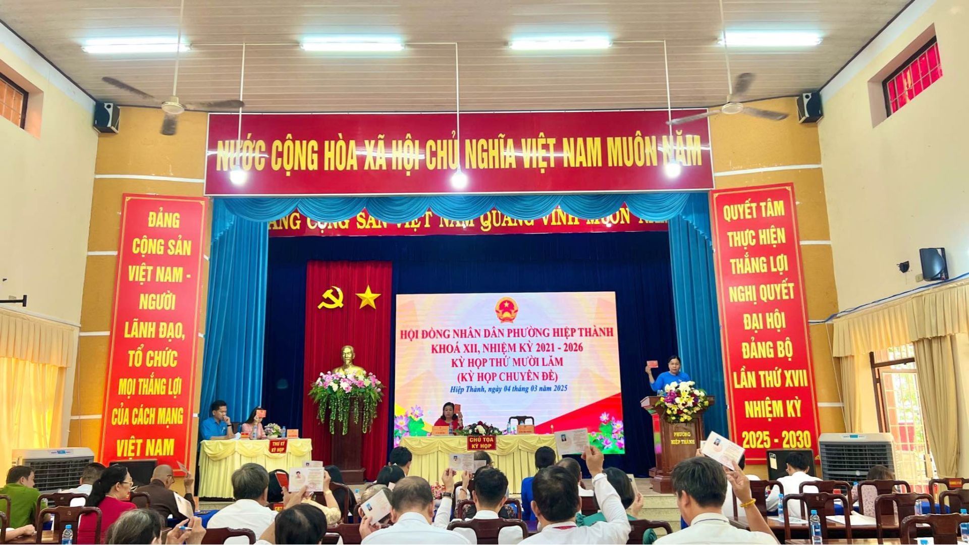 Chiều ngày 04/3/2025, HĐND phường Hiệp Thành khóa XII, nhiệm kỳ 2021 - 2026 đã tổ chức kỳ họp thứ mười lăm (kỳ họp chuyên đề). Đến dự kỳ họp có ông Phạm Minh Thiện - UVTV, Chủ nhiệm UBKT Thành ủy; bà Lê Thị Thúy Hà - Trưởng Ban pháp chế HĐND thành phố; bà Hoàng Thị Hồng Thắm - Bí thư Đảng ủy phường. Chủ tọa kỳ họp có bà Lê Thị Kim Cúc - Phó Bí thư Đảng ủy, Chủ tịch HĐND phường; Bà Lê Thị Hoài Phương - ĐUV, Phó Chủ tịch HĐND phường. Cùng dự kỳ họp có các đại biểu HĐND, các đồng chí là thành viên UBND, Trưởng các ngành, đoàn thể phường.