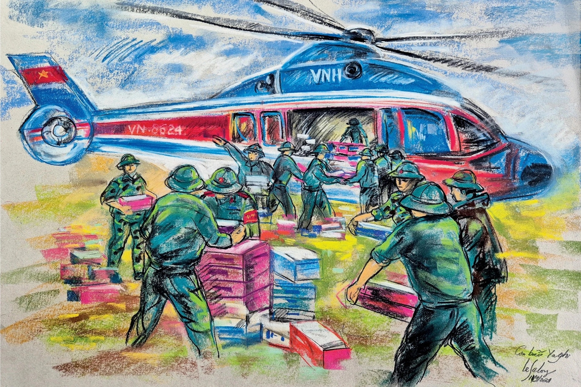 Khoảnh khắc con người vật lộn với bão lũ, lãnh đạo, bộ đội hết lòng giúp đỡ nhân dân... được truyền tải qua bộ tranh "Thương lắm, đồng bào tôi…" của họa sĩ Lê Sa Long.
