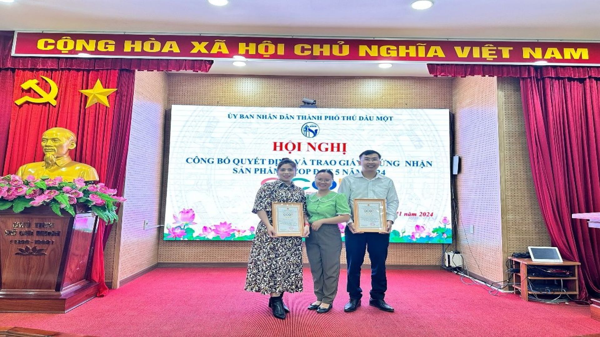 Tại hội nghị, Ban tổ chức đã công bố 6 chủ thể của 21 sản phẩm được Ủy ban nhân dân thành phố Thủ Dầu Một công nhận sản phẩm OCOP cấp thành phố năm 2024 đạt 3 sao, trong đó phường Hiệp Thành đạt 11 sản phẩm chứng nhận 3 sao của 2 chủ thể: Công ty TNHH Nấm dược liệu VNCORDY và công ty TNHH Thiên Thuận Phát Bakery.